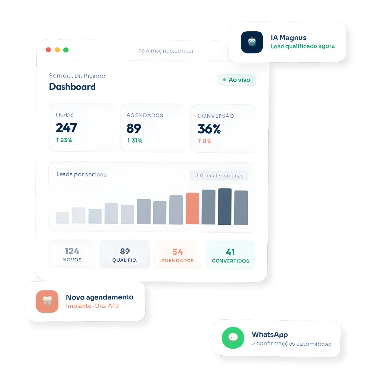 Dashboard em tempo real mostra cada métrica: de onde vem cada paciente, taxa de conversão e ROI. Cresça com previsibilidade.