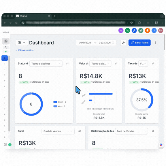 Dashboard unificado com visão 360° da sua operação de marketing e vendas. Acompanhe CPL, taxa de agendamento, taxa de comparecimento, ROI por campanha e faturamento, tudo em tempo real.
